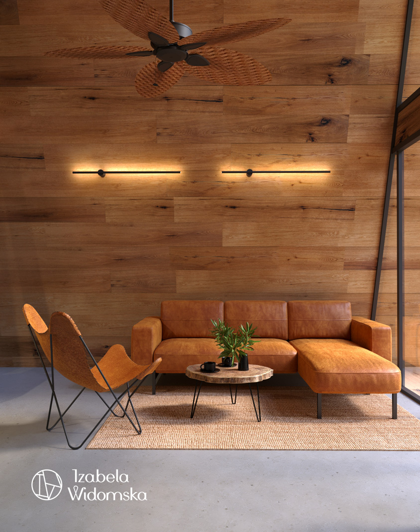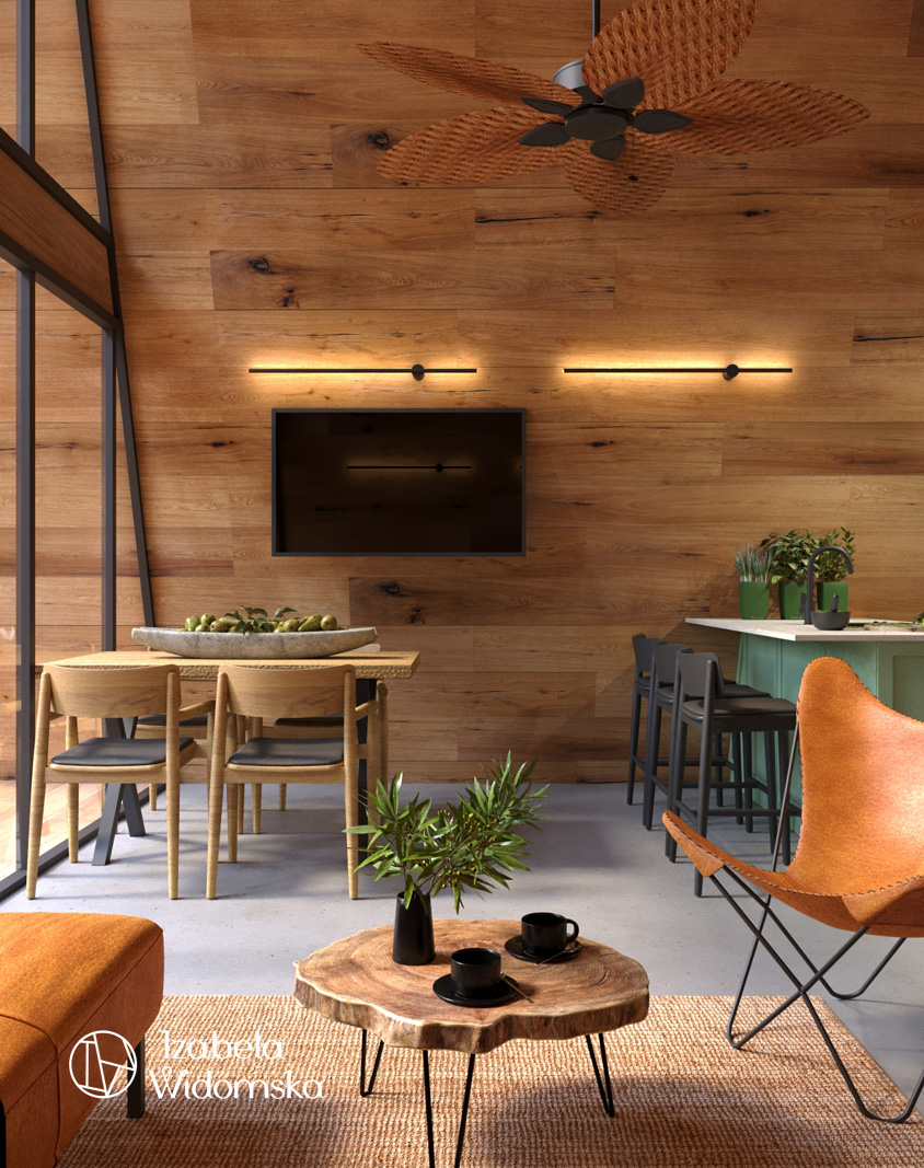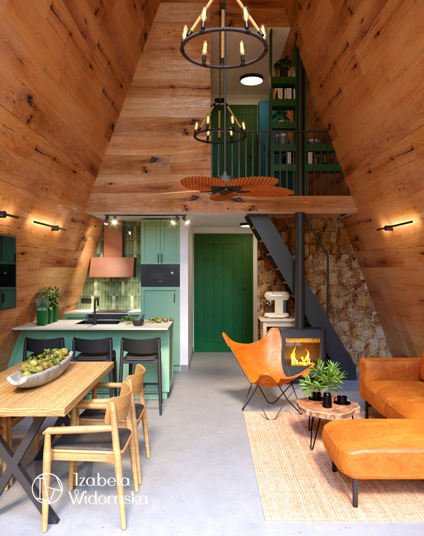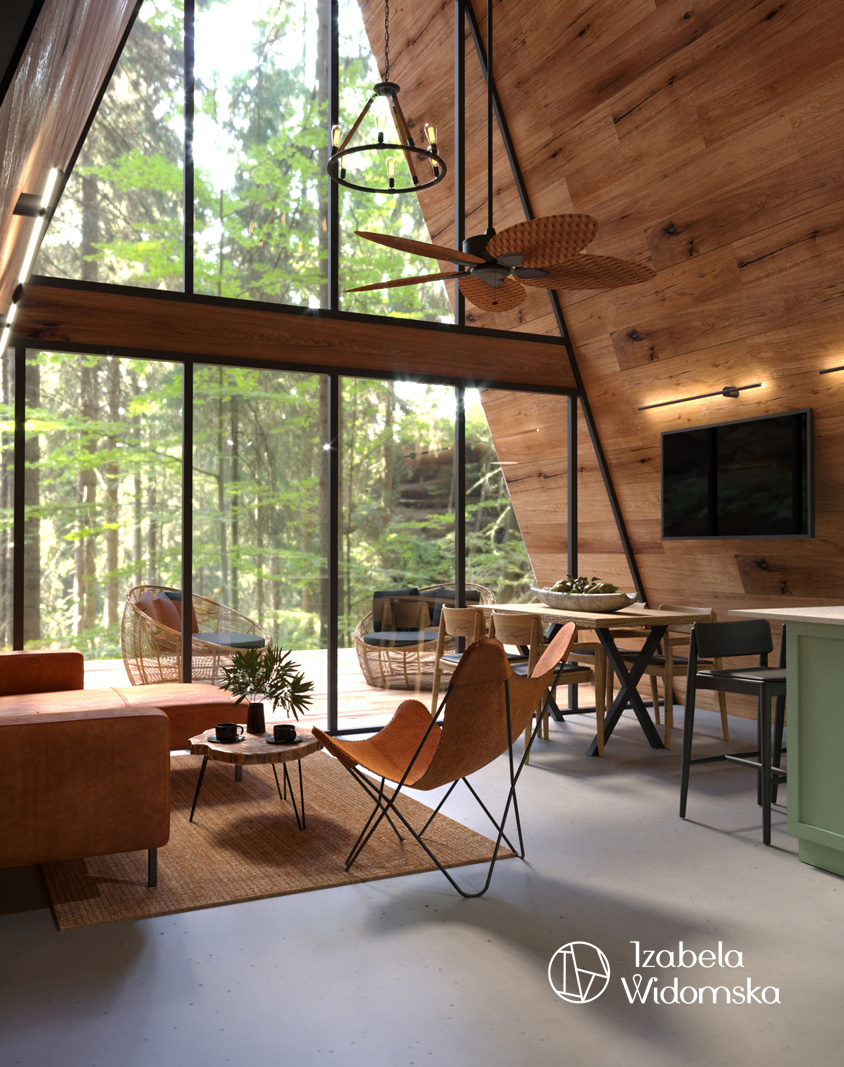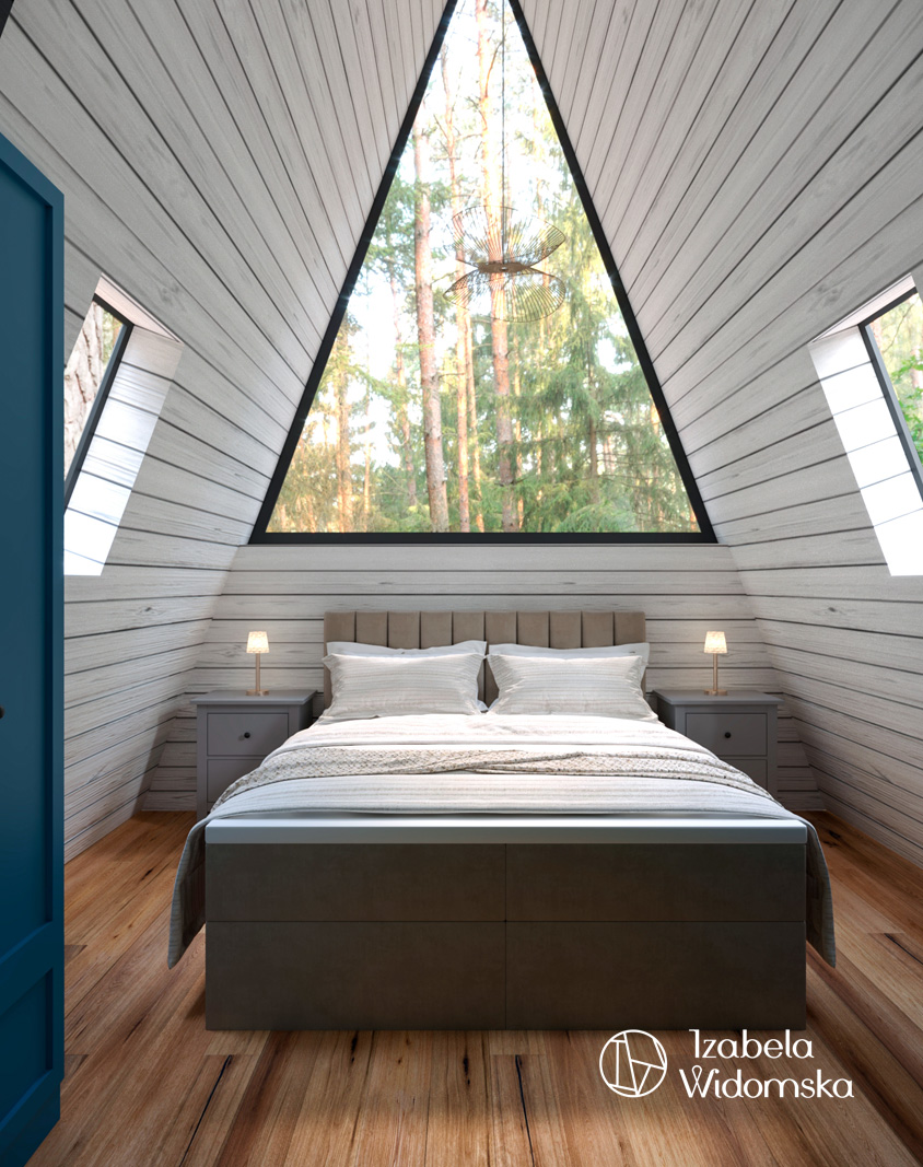 Domek letniskowy w technologii drewnianej w formie trójkąta był często spotykany w czasach PRL. Współczesna wersja takiego domku została zaaranżowana przez architekt wnętrz Izabelę Widomską. Dominującym materiałem wykończeniowym w tym projekcie wnętrz jest wyselekcjonowane drewno w formie paneli ściennych, którymi wykończono całe ściany oraz część sufitów.