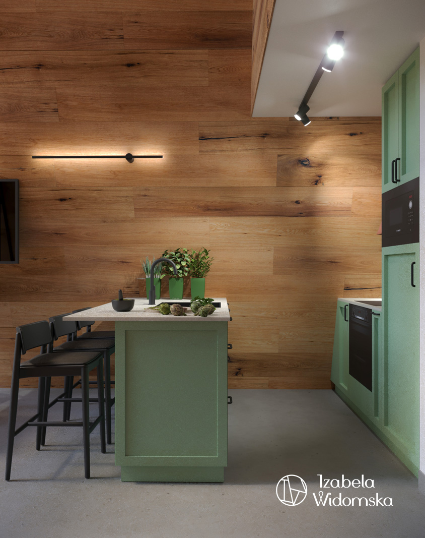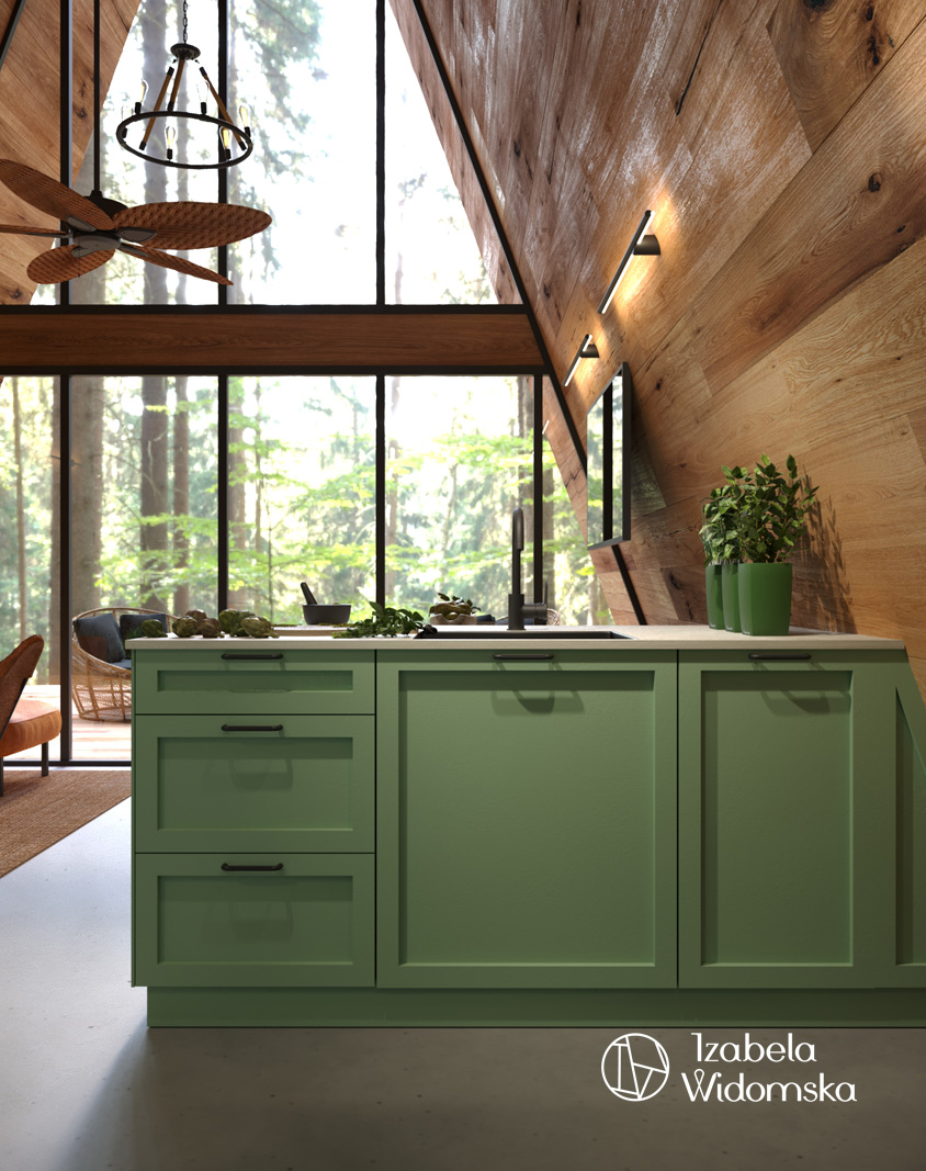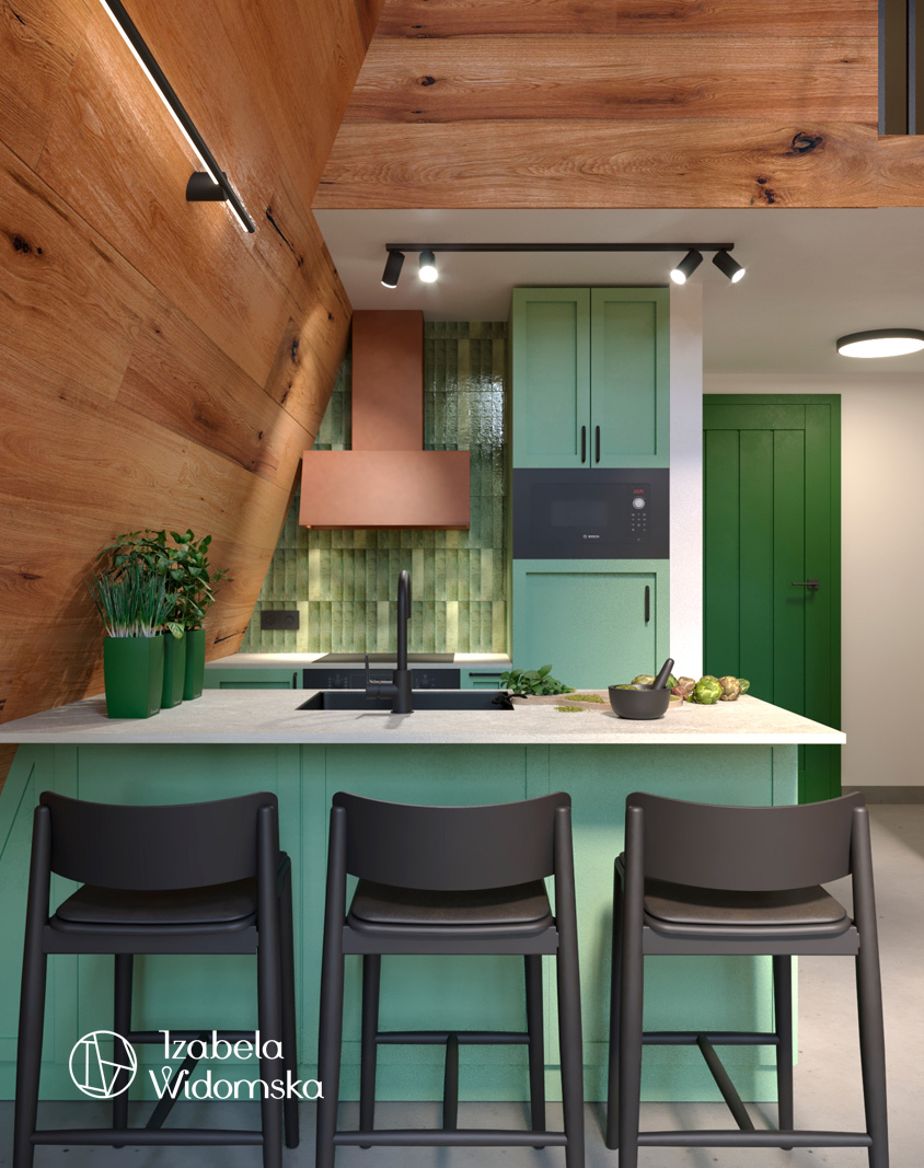 Zabudowa kuchni zaplanowana jest w szałwiowym kolorze delikatnej zieleni. Miedziany okap i zielony płytki cegiełki dodają charakteru , a całość wnętrza sprzyja relaksowi i wypoczynkowi.