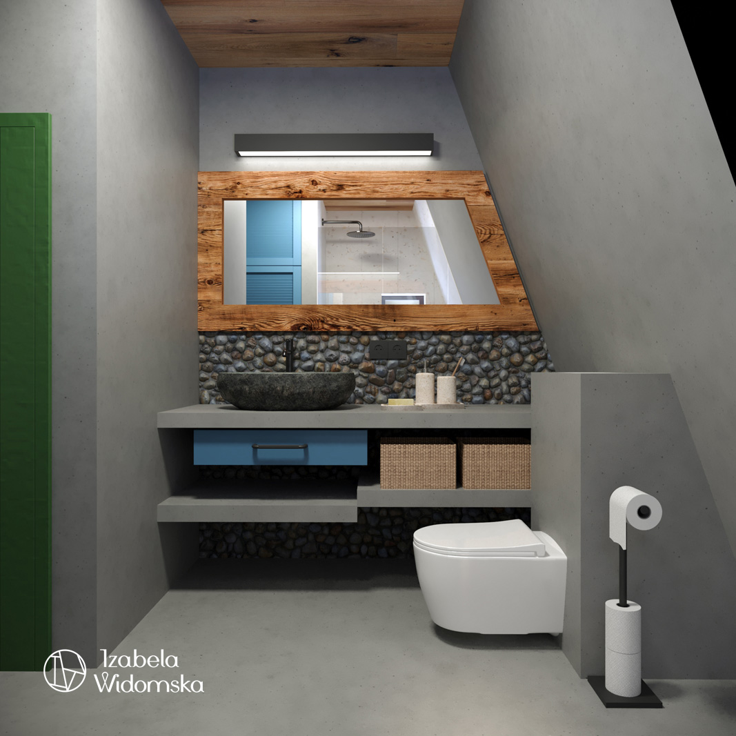 Architekt wnętrz Warszawa Izabela Widomska zaaranżowała to wnętrze w ciepłym i nowoczesnym stylu country. Drewniane meble, kominek w formie kozy, industrialne schody czy ściana wykończona imitacją kamienia czynią ten projekt wnętrz idealnie wpasowanym w otaczający go las i zieleń.